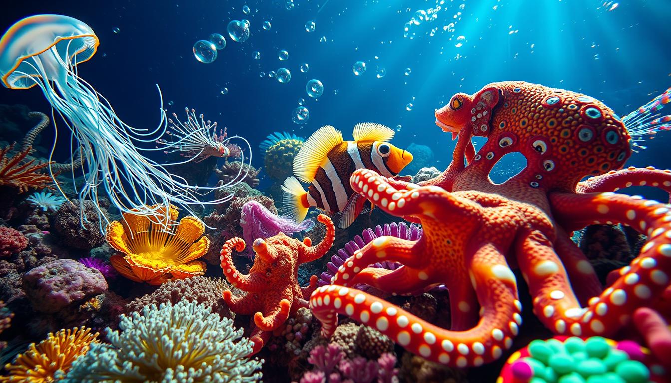 The ocean is a vast, mysterious place. It’s home to many ocean creatures that have evolved in amazing ways. From glowing depths to colorful reefs, the marine life diversity is incredible. Each species has unique traits to survive the changing tides.